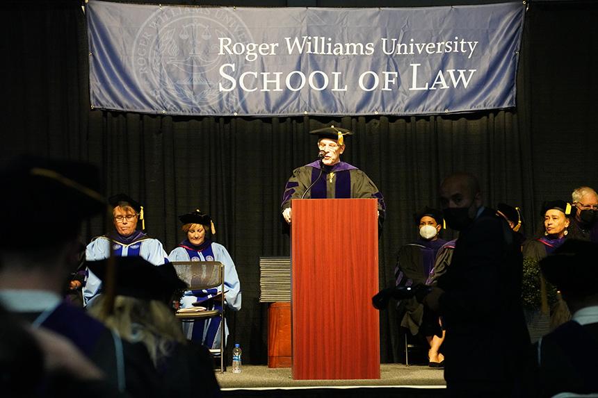 Law student speaker Diana Perez ’18, L’22 – a “double Hawk” who earned her Bachelor’s in Criminal Justice and a Juris Doctor at RWU – thanked the faculty and staff for making her seven-year journey a success and called on her fellow graduates to use their education to make a meaningful impact in the world.