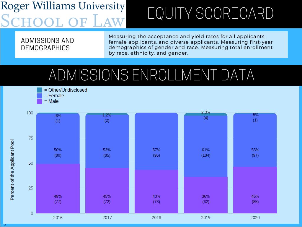 The Roger Williams University School of Law Equity Scorecard was designed to measure the performance of our diversity, equity, and inclusion initiatives outlined in the law school’s Diversity and Inclusion Strategic Plan (2018). Our goal with this scorecard is to measure different elements related to the experience of our diverse student population. The measurements included in this scorecard include the following: admission and demographic information, retention and graduation data, bar passage, academic performance, job placement, and faculty and staff hiring. The different data points collected are intended to give us a view into our progress in creating a diverse and inclusive environment at the law school related to enrollment management, student support, campus climate, and representation within our law school community.